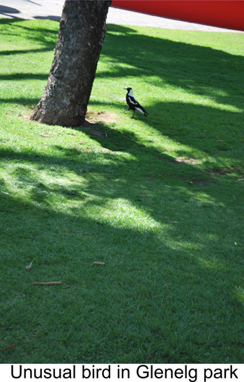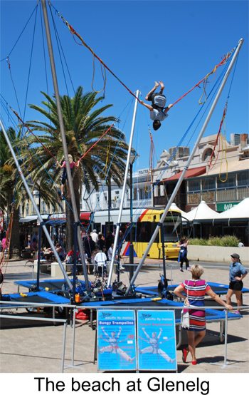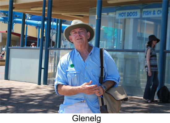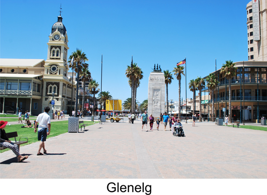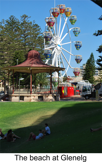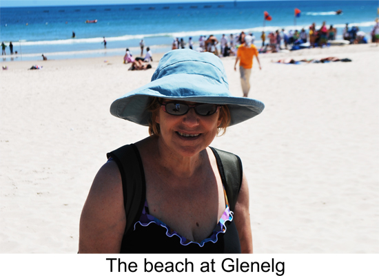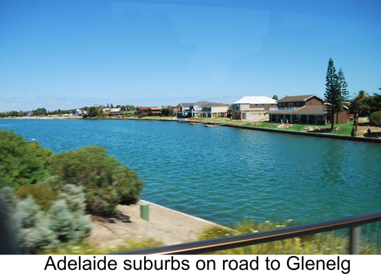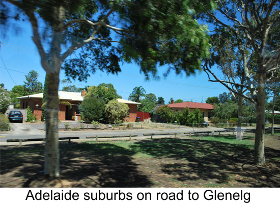 We arrived n Adelaide on a Sunday. Well it was not exactly in Adelaide, the city itself is about 10 miles away from the port. So instead of going into the city, we decided to take a bus to Glenelg, a beach town about 30 minutes from the city up along the coast. After passing through the industrial around the port, we drove through the Adelaide suburbs, After a time we realized that the area looked a lot like Fort Lauderdale with canals, low houses and palm trees. Glenelg is a busy little beach town sort of like Rehoboth with a funny accent. |