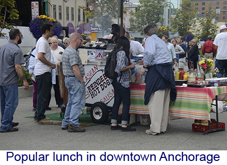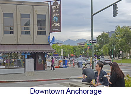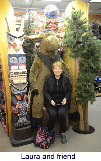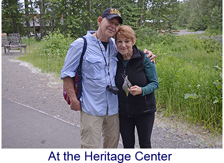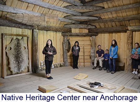 It took almost the entire day for our bus to get us from Denali to Anchorage ( with a stop for lunch at Talkeetna). Most of the trip was through very scenic and seemingly mostly uninhabited country. Anchorage is the only real city in Alaska with nearly 300,000 people ,over half the population of the state We checked in at the Anchorage Marriott and went off to find a restaurant for dinner. Our first choice, the Glacier Brewhouse, had a hour wait so we went next door and had a very nice meal at Orso. After eating, we took a walk down to the waterfront. The weather was quite mild, sunny without much wind. Alaska is far enough north that during the summer the sund doesn’t set unti after 10:00 pm and it never gets truly dark at night. Anchorage, like Baltimore, is home to many ravens, especially along the waterfront. We had them flying overhead throughout our walk. The next morning we took our bus to the Alaska Native Heritage museum. It’s a fascinating place and we could have spent a day there but because we had to get to Seward to pick up our ship, we could only spend a couple of hours. What was particularly interesting were native artists and craftspeople working of projects in the museum. They were more than happy to talk with us. Some of their artwork is truly amazing. Laura could have spent the day just talking with them. On the way to Seward we drove back through the city and stopped for lunch. At the recommendation of Mary, our guide, we ate reindeer hotdogs from a cart infront of the Federal building. Then back on our bus to get to Seward. |