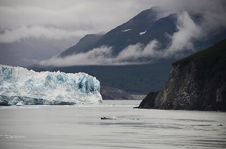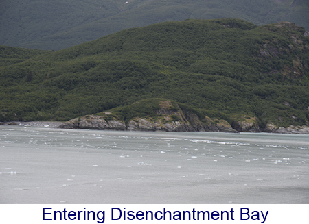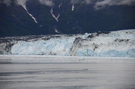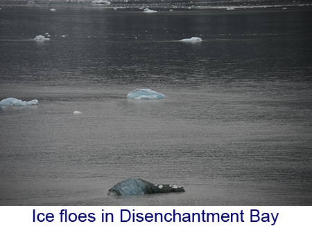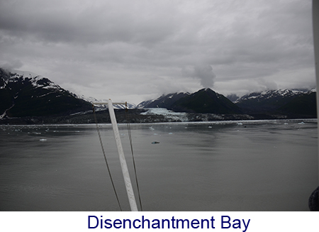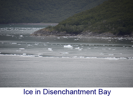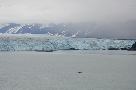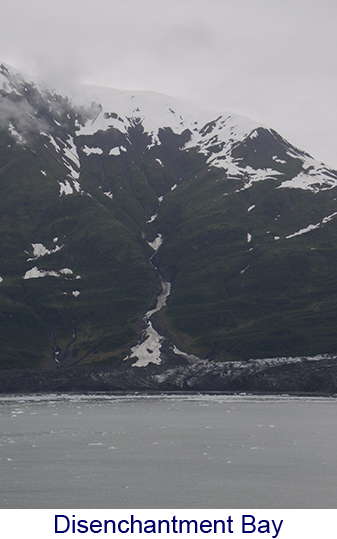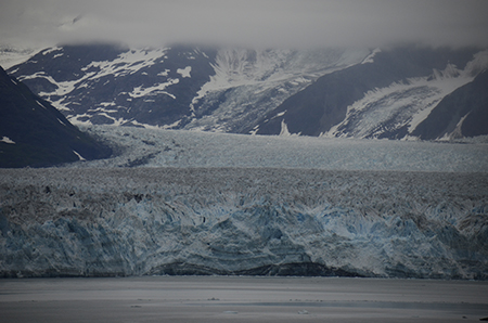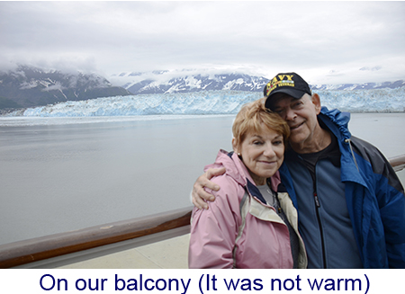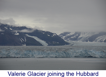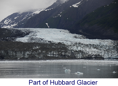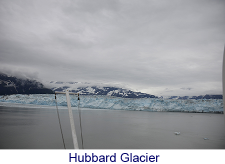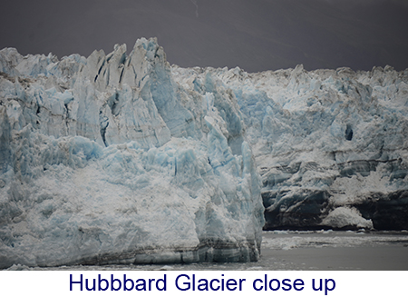 We left Seward at about 8:00 and headed for Yakutat Bay and the Hubbard Glacier. The Hubbard glacier is one of the few glaciers in the world that is actually advancing. This happens because it is joined by the Valerie glacier just before it reaches the waters of Disenchantment Bay and the addition of ice from the Valerie glacier is causing the advance. When we booked this cruise last year, friends on the ship told us to try to get one of the five stern cabins so we could see the whole panorama from our cabin balcony. They were right. We invited some friends and had a glacier party with champagne and cheese and fruit whie we watched the glacier unfold before us. We had seen glaciers in Norway last year but never anything like this. The ice at the front of the glacier was blue. And there were small ice floes in the water as we sailed also blue but no major icebergs. Nor did we see and icebergs calving off the glacier. However, the captain did get us as close to the glacier as possible and spun the ship so passengers on either side could get a good view. |