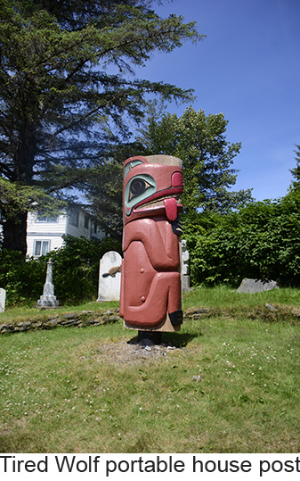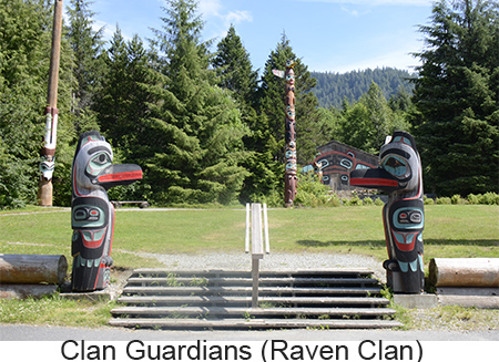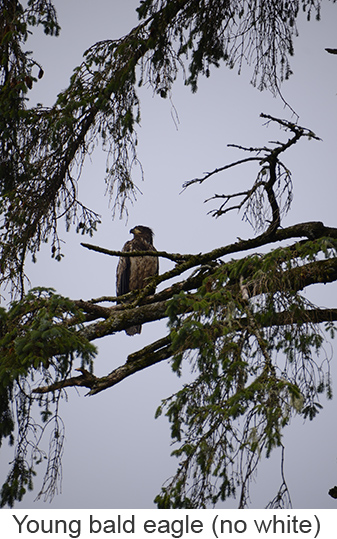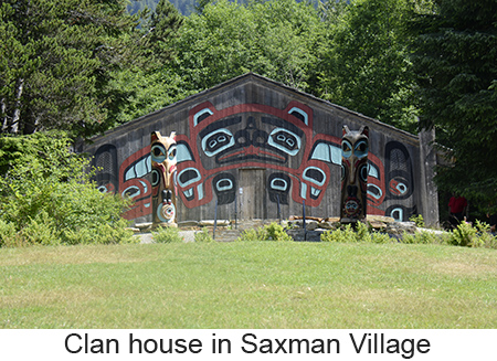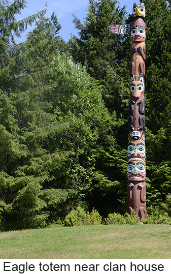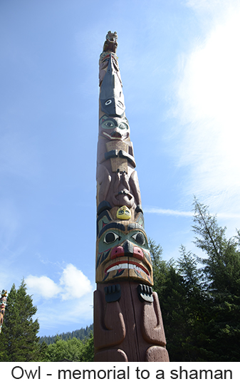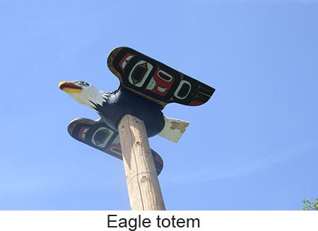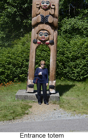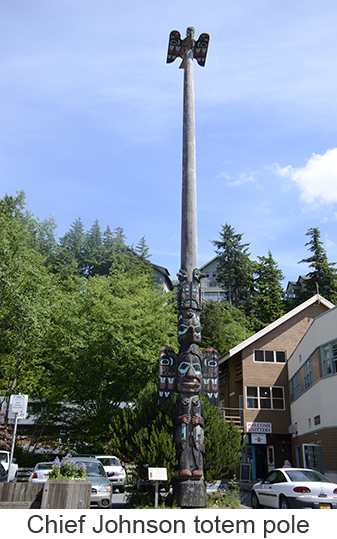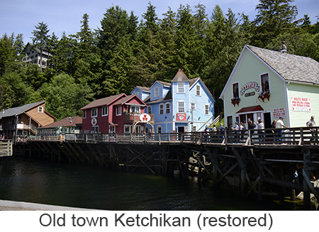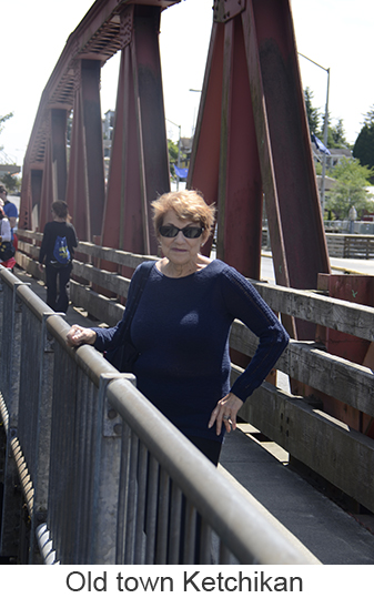 In Ketchikan the shops were back so got a local tour to see eagles, totems and possibly a black bear. Our guide was a native woman who had lived in Ketchikan her entire life and had studied native herbal medicines. She showed us a form of kelp and had us break it open and rub it on our skin. It works very well as a moisturizer and I wonde r oif it couldn’t replace some of those very expensive anti-wrinkle creams. We went to part of the village with a large number of totem poles and our guide told us some of the legends associated with the totems. Visitors are not allowed in the rest of the village without permission. We did see a black bear there — raiding someone’s garbage. Laura asked her which stores were owned by local people and sold real local crafts (not made in China). She named two places. The first, the Crazy Wolf studio was right across the street from where we got off so in we went. I was wearing my Vietnam vets hat and the owner, Ken Decker, also a vet asked me where I served. When I told him I was a river rat based a Sa Dec it turned out he was a Navy SeaBee at the same place at the same time I was there. We talked for a long time. The other store was called Rain Barrel. It had beautiful native sculptures from whale bone, walrus bone, stone, wood and antlers. |