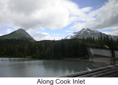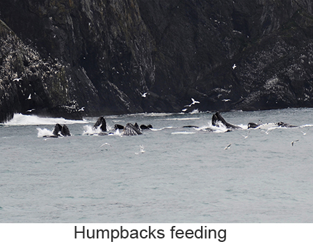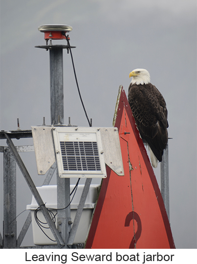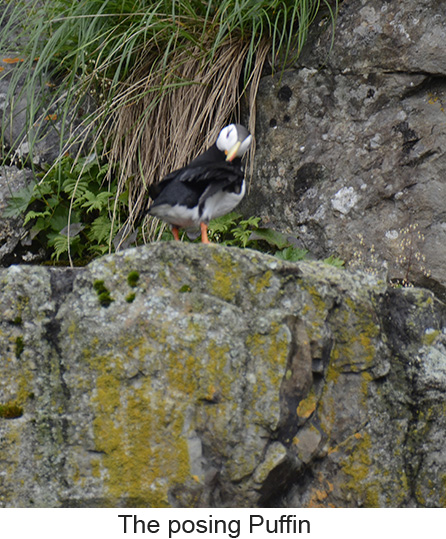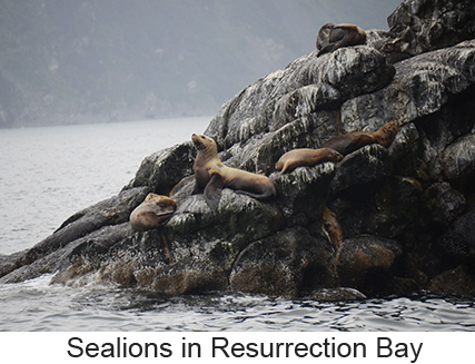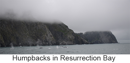 There is one thing about Seward, it rains --- a lot. In fact it rains or snows 171 days of the year. We were lucky, when we left for on morning whale watching cruise there was only a light drizzle. We were doubly lucky in that even though we had only a short cruise through Resurrection Bay ( the 4-hour cruise is the shortest given by Denai Fjord cruises) the wildlife was out in force. There were sea lions and porpoises and gulls and puffins and whales, pods of humpback whales. The whales really put on a show. According to our captain, some of the whales here had developed a process for feeding. Some of the males make a ring of bubbles to drive their food into one small areaand then the whole pod feeds. Our captains told us that only this one group of whales does this and that the same behavior by the same whales had been observed in their winter grounds off Hawaii. It was breathtaking to see a dozen or so whales in a very small area coming up out of the water and feeding . Some of them were very big and some were juvenile. The boat had an underwater microphone and we could hear the humpbacks communicating while they were feeding. Even th captain was surprised by the amount of activity. Then there was the posing puffin. Puffins are comical looking birds with their oversize beaks. However it’s very difficult to get pictures of any bird in flight froma moving boat. However the on puffin landed on the rockface and posed for pictures. We returned, elated by what we saw and at least for Laura and I,we saw no reason to take any more whalewatching cruises since nothing could top what we saw. We had lunch and then rode the bus to our ship. One thing nice, those of us on the land tour were allowed to board a couple of ours before everyone else, making the entire process very easy. |