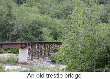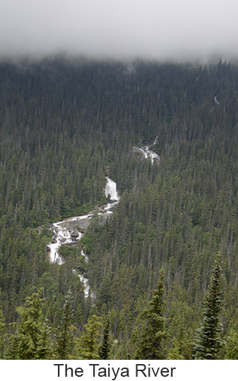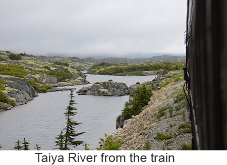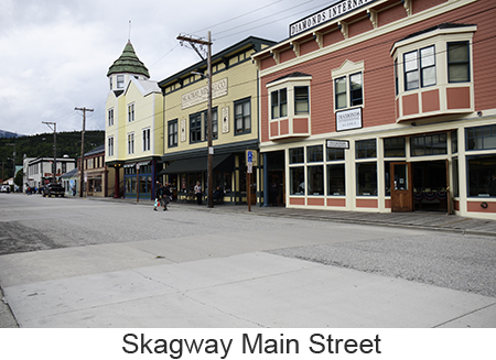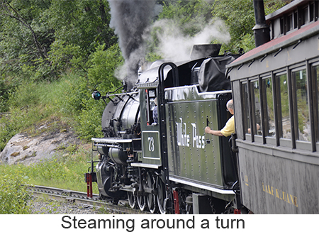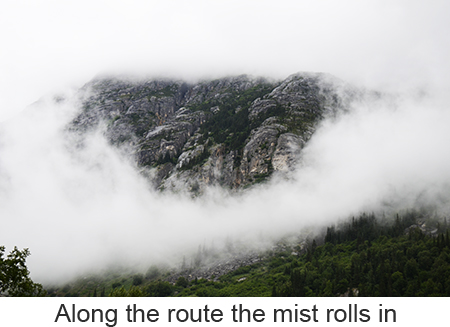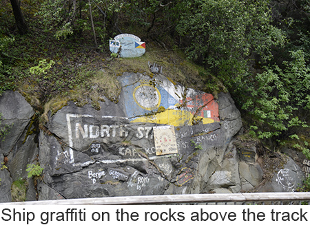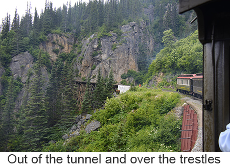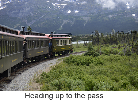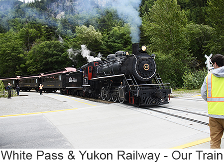 We arrived at Skagway, a town of about 1,000 people at 7:00 in the morning we woke a little earlier than we had to because we misread our tour tickets and thought we needed to leave at 8:45 when we didn’t need to leave until 11:00. So we had a leisurely breakfast and went down to the pier. Skagway was one of two places we booked a ships tour on the White Pass and Yukon Route narrow gauge railway which traces part of the route of the original gold rush. We took the steam train rather than the diesels because I love steam engines. We got on a bus to the train depot in a light drizzle. Fortunately it never got any worse and improved toward the end of the trip. The ride itself was fascinating up the mountain to the pass, close to the edge of the gorge with white wate below. Mountains, half obscured by clouds, in the distance. Meantine the engine chugged away throwing off clouds of smoke from the boiler. We went through two tunnels one short and one a bit longer and over wooden trestle bridges. At the White Pass they served champagne and Milano cookies to commemorate the event. Once through the pass we crossed into Canada’s Yukon Territory. We had been told that we needed to bring our passports though no one ever checked. A short time later we filled up the boiler at a water tower, the wheels and pistons were checked and we turned around in a siding. Once we got back we got off the train and walked through the small town of Skagway. As we were walking our train came by going into the yard so I was finally able to get a good video of the train complete with the sound of its steam whistle. |