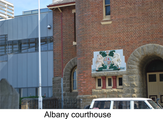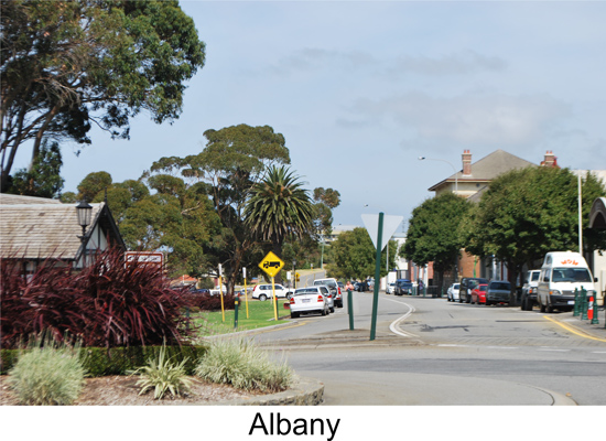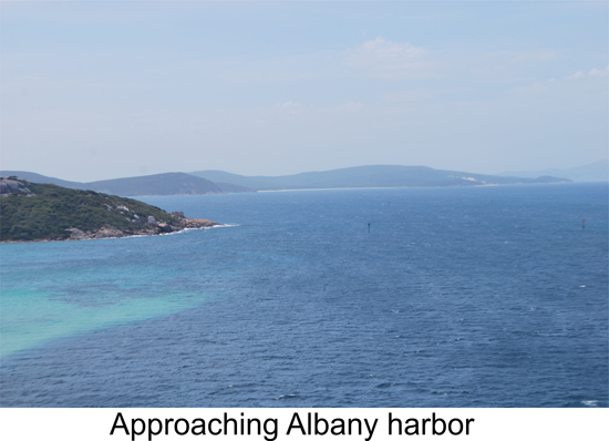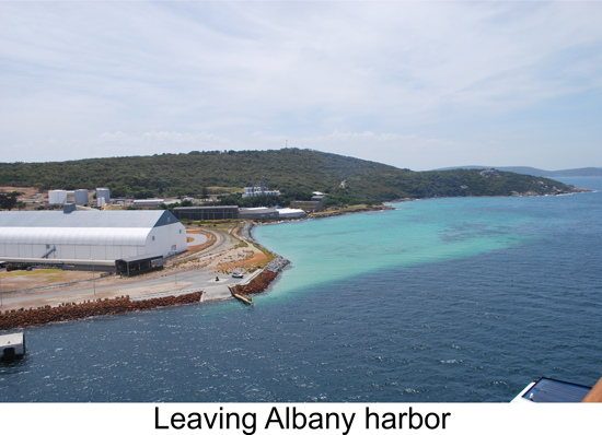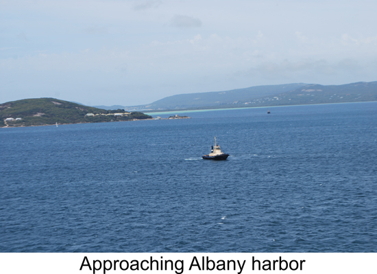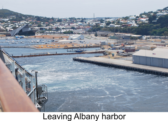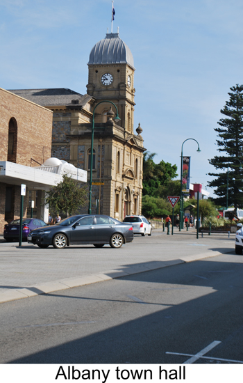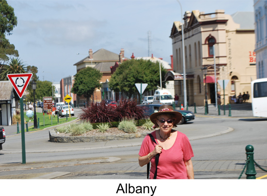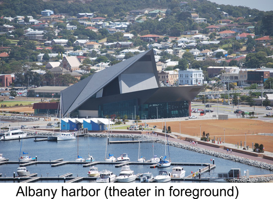 Weather delayed our arrival, so we had only had a couple of hours to spend in Albany and we couldn't really see much. Albany has a natural deep water harbor which eventually made the town a major processing center for the world's whaling fleets. There was a whaling museum but it was out of the town itself so we didn't have time for a visit. Albany was also the port from which 30,000 ANZAC troops for the World War I battlefields of Gallipoli so there is also a war museum, this on top of Mount Clarence and also too far for us to visit. Instead we walked around the town and explored the port area. There is one unusal building, the theaterwhich is very modern compared to every other structure |