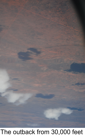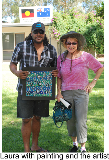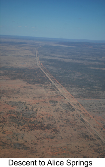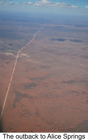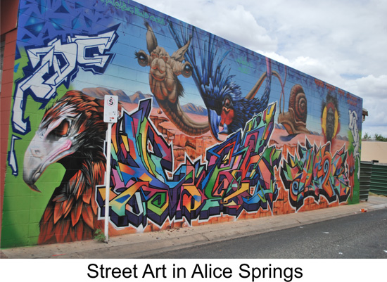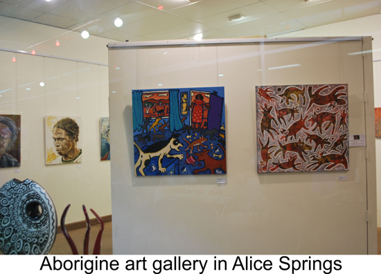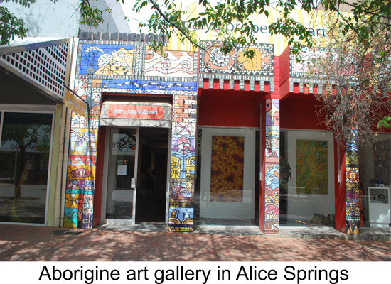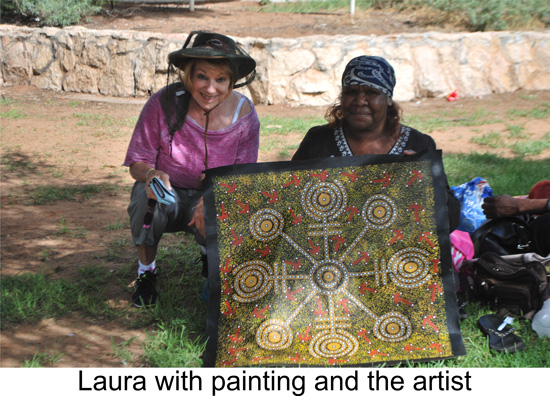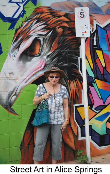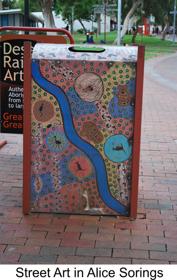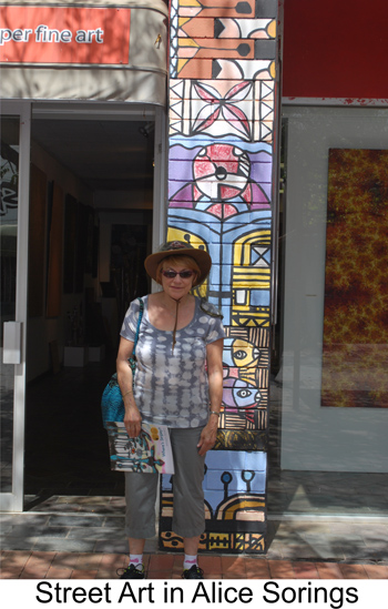 Alice Springs is the hub of the 'red center' the Australian outback. It's a town of about 25000 including about 6000 aborigines and provides medical and educational services to the isolated communities and stations in the thousands of square miles of the outback. Alice, as it's known, is also the center for aborigine art with literally dozens of galleries and artist studios. Because we were here on a weekend we were not able to visit the studios but we did manage to go through many of the galleries and talk to some of the street artists. The art itself was very interesting with each painting telling a story using traditional patterns handed down over the generations. The original aborigine color palette was limited to reds, yellows browns and black by the pigments available in nature. Modern aborigine artists, while still telling the traditional stories using the traditional patterns, are using acrylic paints which make a lot more colors available. There is also a wide variety in the quality of the art ranging from paintings that were dashed off to sell to tourists to works that took hours or even days of meticulous work to complete. There was also a variety of jewerlry, glass, ceramics and clothing made by local artists both aboriginal and not. Alice is hot (100 degrees +) and dry and unless you're a camel you carry lots of water. Everything is very laid back and the people, as in most of Australia, are very friendly and helpful. The food is not great but the portions are enormous . Laura and I ended up sharing most meals. |