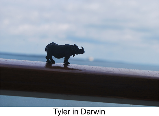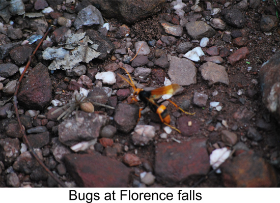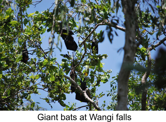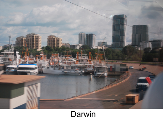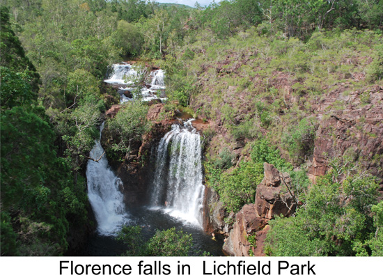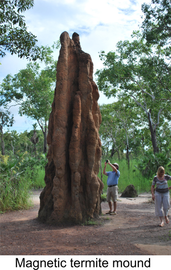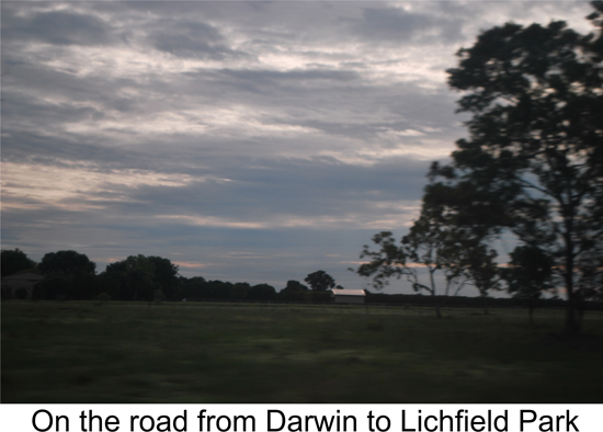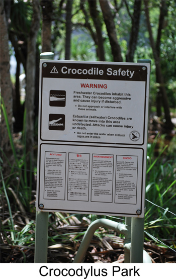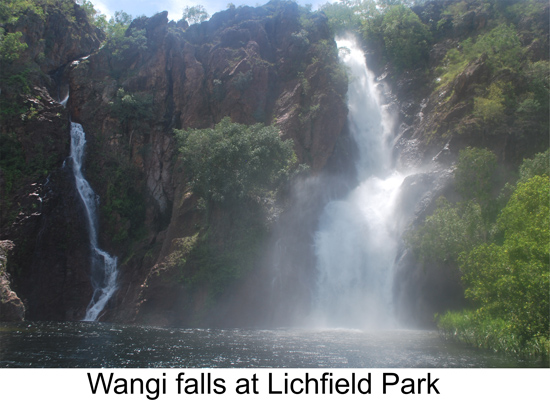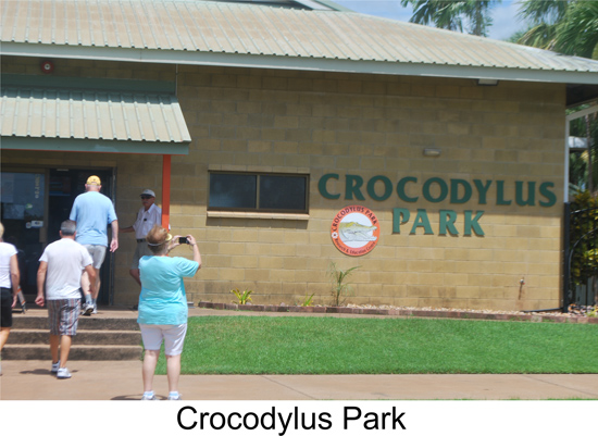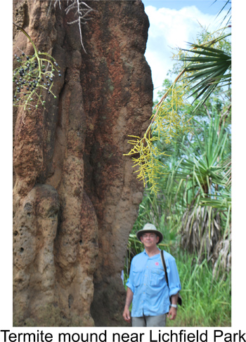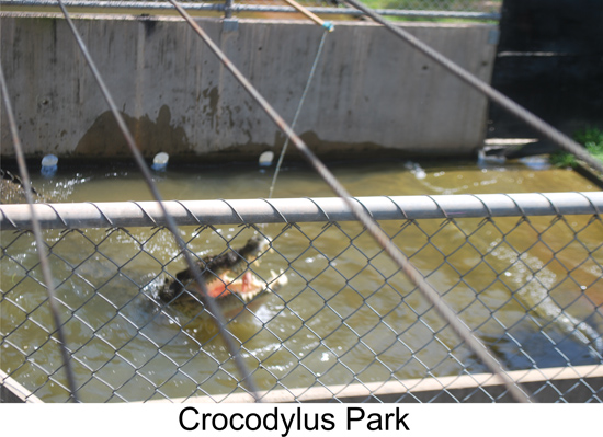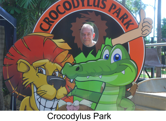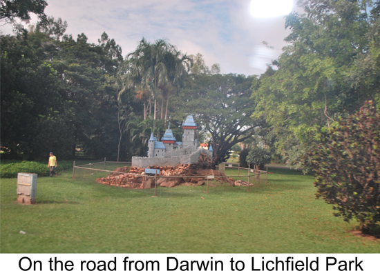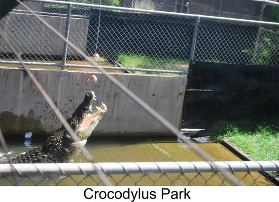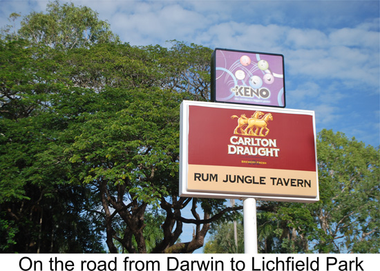 We only saw Darwin in passing as we decided to go to Litchfield National Park, about 80 miles south of the city, and then to the crocodile research center where they are developing crocodile farming for meat and hides. It was very hot and humid as we're in the tropics during the rainy season and the air conditioning on our bus could barely keep up. During the ride to the park our guide filled us in on the history of the area. Darwin is the capital of the Northern Territory -- known as the 'Top End'. In 1974 a cyclone (think hurricane) just about leveled Darwin, so the city had to be almost entirely rebuilt. The outer suburbs on the other hand remained mostly intact and contain some strange buildings. There's a playhouse built like a castle that seems to have gotten completely out of hand. The Carlton sign is to remind me of Carlton Mid the one beer in the world that Laura actually likes. I want to see if I can get hold of it when I get home Our first stop when we got to the park was at the magnetic termite mounds. These things are enormous, up to 20 feet high. Why magnetic, well the mounds are all oriented on a north-south axis for cooling purposes and the theory is that the worker termites have a built-in compass that points them north. Leaving the termite mounds we visited a number of spectacular waterfalls with deep pools that looked very inviting in the heat. However, there are signs throughout the park warning that swimming is at your own risk as there may be crocodiles. The crocodiles can travel over land for long distances so they could be in any deep pool or waterhole. There are descriptions of other animals and birds that may be found in the park (we even heard a kookaburra off in the distance). There was one animal they did not describe -– the giant bat. There was a tree full of them just hanging around at Wangi falls. We had lunch at the park –- the less said about that the better -– and then off to the crocodiles. You don't realize how big they actually are until you see them. And they can get pretty high out of the water jumping for food. Crocodiles are being raised in Australia for hides and meat. There was a sign advertising crocodile meat frozen for the barbeque. If I had a barby available I would have bought some.