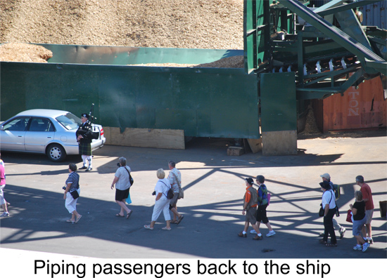 Our next stop was Dunedin toward the bottom of New Zealand's south island. It was originally founded by Scottish settlers in the mid-19th century. The plans for the city were drawn up in Britain without regard to the actual lay of the land in New Zealand so the results were not exactly as expected. Among other things were streets that went almost straight up including what is in the Guiness Book of Records as the steepest street in existence. However, we didn't see much of the city because we were offered a tour I couldn't resist -- a beer tasting tour of the four pubs in Port Chalmers. the cruise port for Dunedin and a major export terminus for New Zealand lumber. Three of the pubs, The Tunnel Inn, The Port Chalmers Hotel and Chick's Hotel date from before 1900 and are all what I'd consider locals. The Cary Bay Inn is much more modern and upscale. Laura came along on the tour to keep track of my drinking but she must have lost count in the middle. She had me drinking almost two gallons of ale and beer in under three hours not possible, even for me. Maybe her sampling of some of the lagers and the porter -- she didn't like it -- made her lose count. In any case We had a choice of lagers, a stout, a porter, pale and dark ales, and IPA beers from Speight's, Emerson's, Monteith's, DB, Macs and Pride of the South microbreweries. IMHO Emerson's JT (an IPA beer) is the best in New Zealand. At the Cary Bay Inn we were served a buffet lunch of bread, cheese and fresh shellfish a perfect accompaniment to the beer. On the way back to the ship we stopped at the maritime museum which was an interesting composite of New Zealand south island history. In keeping with its Scots heritage, a piper played us back onto Solstice as we boarded to leave. |
