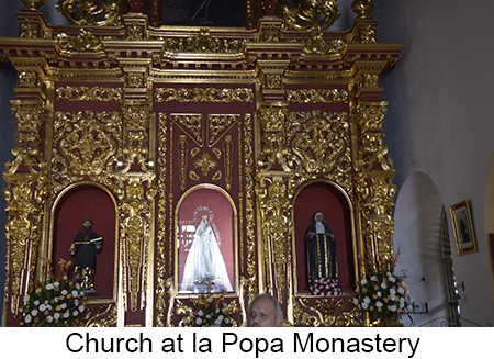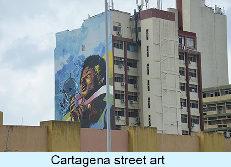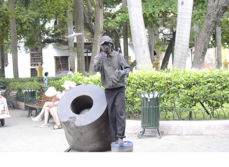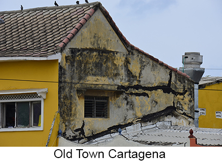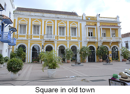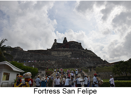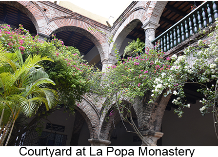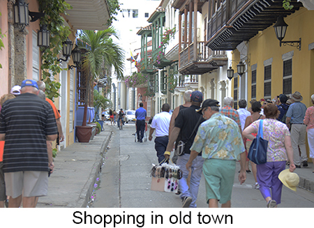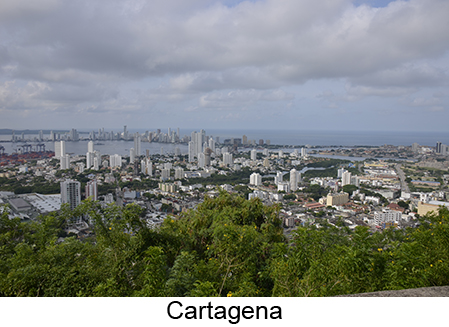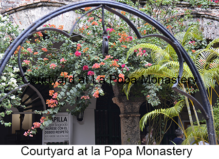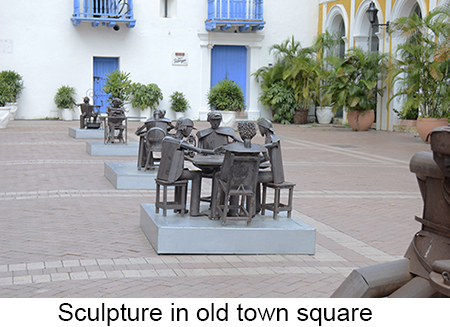 Cartagena was our first stop after two days at sea. One of the oldest cities in the western hemisphere with about 1.5 million people. Since we’ve never been here before we decided to take a ship’s tour passing through the old city to the la Popa Augustinian monastery. Instead of taking a tour we got off the ship and walked into the town. There are many of the old Victorian houses no converted to bed and breakfasts, all with beautiful gardens. In fact it almost looks like there is a garden competition with each garden trying to outdo the next. We entered into a beautiful central courtyard filled with flowering plants and a church with the entire altar area covered in gold leaf. The monestary, atop the highest hill in the area offers panoramic view of the city. Before going to la Popa we stopped at the fortress of San Felipe, the largest Spanish fortress in the new world. After the monastery we went down to the old city and a stop for cold drinks and a folkloric presentation – music and dance. After that we went to the old city. We found an interesting plaza filled with contemporary metal sculptures and another with the typical monuments and cannon but with people made up to look like statues. After walking around the old city for a while we got back on the bus and then back to the ship. On the way back we looked in on a shop that specialized in blue pearls. They are produced by inplanting an object in an oyster shell which produces a irridescent blue pearl. We'd never actually seen one before. |