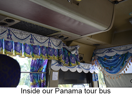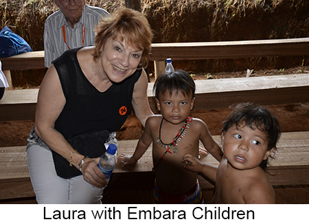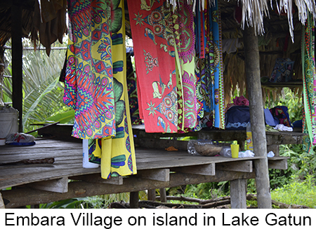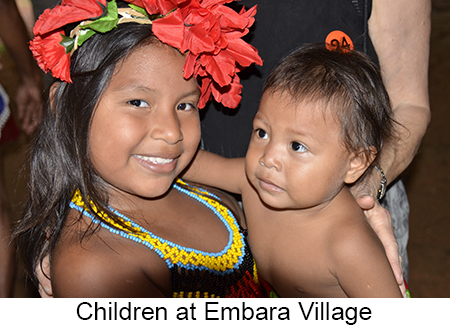 We decide on the grand tour of Panama with stops at one of the locks and a boat trip on Lake Gatun. We drive through Colon one of panamas two major cities. We pass the mixture of a modern business district, some very wealthy areas and a lot of slums. Our guide tells about the country and its history especially the building of the canal. As our bus drives through the countryside, we pass small villages and plantations. Many of the buildings were left over from the American ownership of the canal zone (turned over to Panama in 1999). Some of the barracks have been made into civilian housing and swimming pools and a golf course have been converted to public use. . We pass major construction sites where a new lock is being built so the canal can handle the monster bulk carriers, container ships and cruise ships that now have to either travel around South America or off-load on one coast. The original canal was completed in 1914 and according to our guide building the canal was the equivalent of building 63 great pyramids. . We stop at the control tower of the Gatun locks to watch the operation of the canal. We are lucky enough to arrive when two ships are in the locks, one heading north to the Atlantic and the other heading south to the Pacific – the canal does not run east-west as many of us assume. Watching how the locks operate is fascinating, the opening of the gates, the opening of flooding chambers, especially with two ships heading in different directions. Tolls are calculated in various ways and containerships are charged for each container – toll for a big fully-laden container ship can run half-a-million dollars. . After reluctantly leaving the lock command center we travel to the Melia hotel on Gatun Lake for lunch. Then we board a boat for a trip on the lake. Since the lake is man-made, it is filled with tree stumps, the ruins of drowned villages and other structures. We stop at an Embara village one of the indigenous tribes of Panama), mainly so they can sells us souvenirs. It’s not a hard sell and the kids are incredibly cute. |