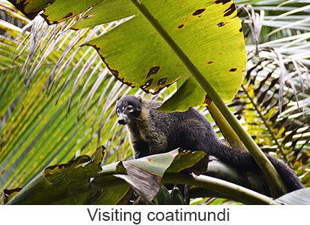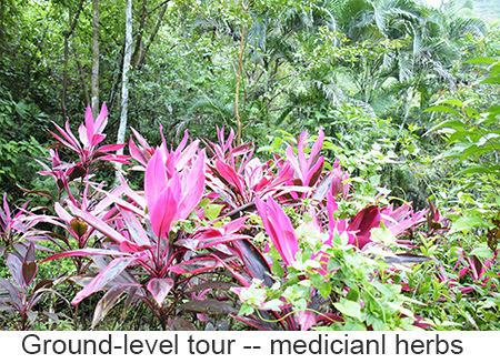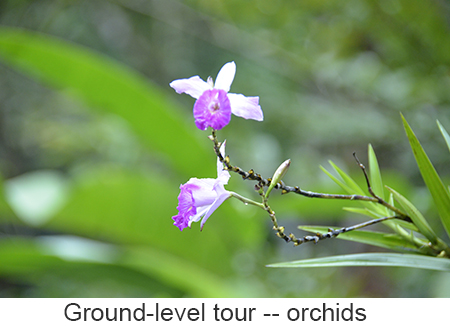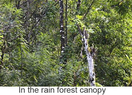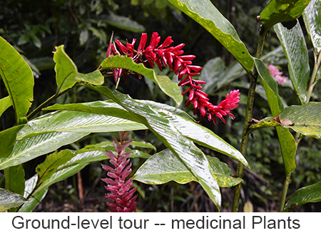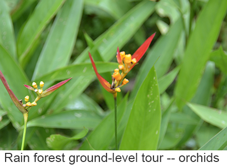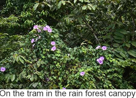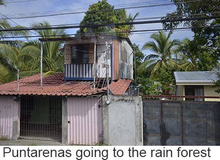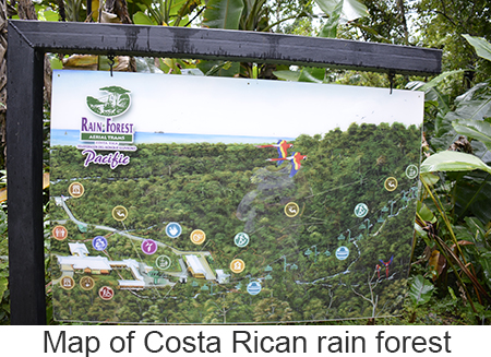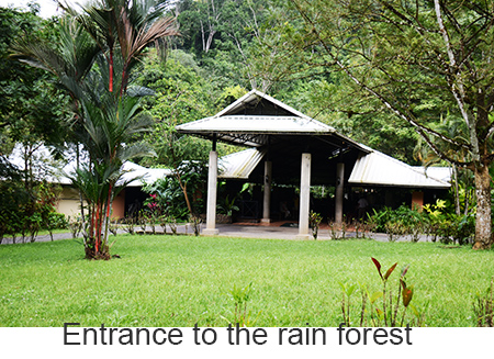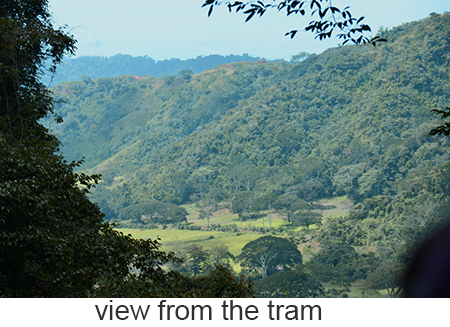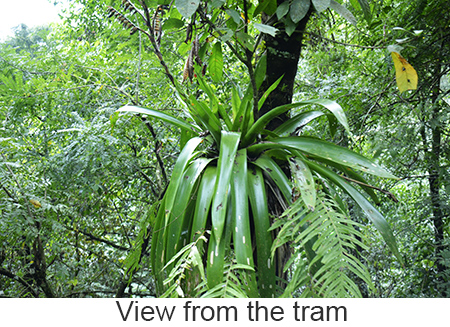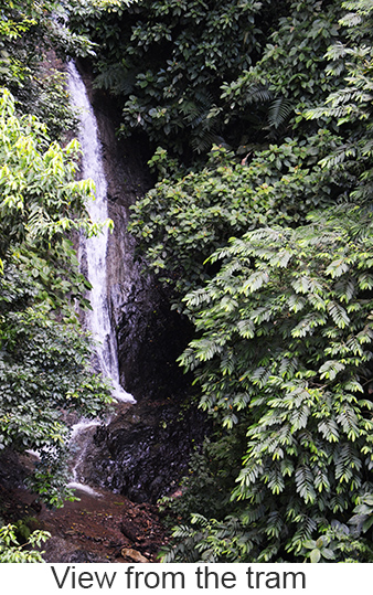 Our tour started with an hour bus trip to the rain forest preserve for an aerial tram tour through the forest canopy. We had three guides one on the bus, the second on the tram and the third during a walking tour on the forest floor. All were very knowledgeable and informative. During the trip out, our guide gave us a brief history of Costa Rica and some insights on how their system works. At the rain forest preserve we boarded a tram (eight passengers and a guide for a trip through the forest canopy. Our guide explained the forest ecosystem and pointed out some the wildlife we would not have seen on our own. The forst itself is beautiful with its flowers and waterfalls. We heard but did not see any birds and the multicolored butterflies and moths were darting around to quickly to get pictures of. There was an iguana and one of those brightly colored poisonous frogs. The plantlife is amazing – all those small indoor plants we have at home grow to giant size in their natural habitat. During our walk on the forest floor we saw a number of poisonous and non-poisonous snakes – all in glass cages along with a giant non-poisonous frog. Our guide pointed out a number of medicinal plants some with brilliant colored flowers and a tree with red bark that is used to make a tea that can help diabetics. After the tours we went to the park cafeteria for lunch – rice and beans and chicken and plantains and then back to the ship. |