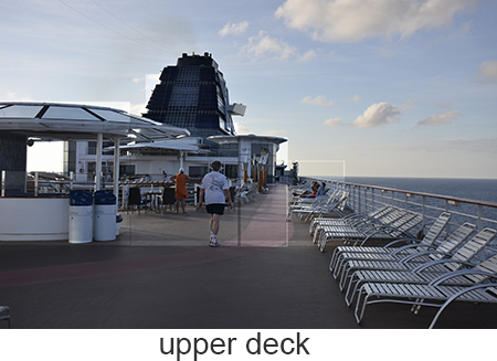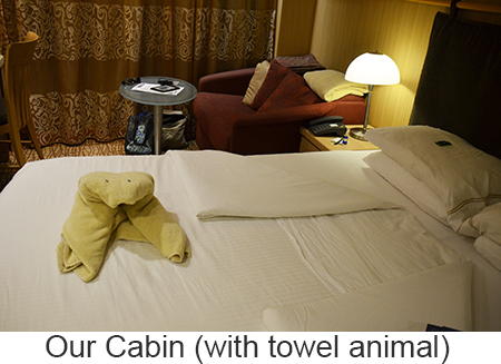 The ship is considerably smaller than the Solstice on which we cruised around Australia but it's the largest cruise ship that can go through the Panama Canal. It's 962 feet long and displace 92,000 tons. It clears the locks by about 2 feet on each side. The ship was refurbished a couple of years ago and has some amenities we haven't seen before. Both the indoor and outdoor pools have wheelchair lifts and the indoor pool has been converted into a therapy pool sort of a giant hot tub. Much of the furniture has been replaced (though unfortunately not in our cabin. The service, as usual is exceptional. Our cabin is smaller than the one on Solstice but has a nice balcony and a large bathroom. The balcony gives the cabin an airy feel. There's music throughout the ships with groups playing in the various lounges. The shows have been good. |