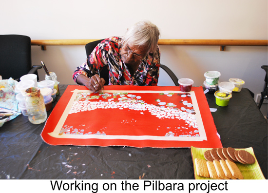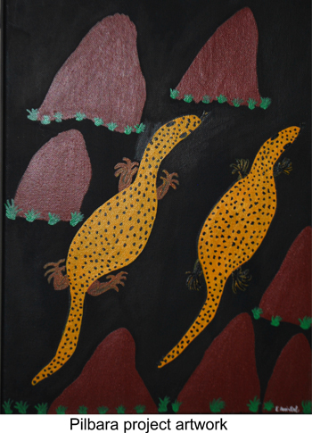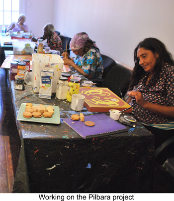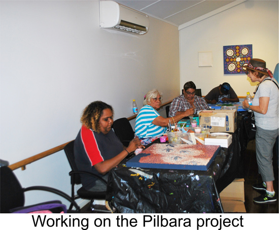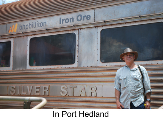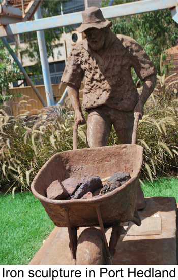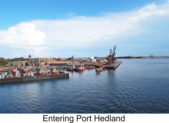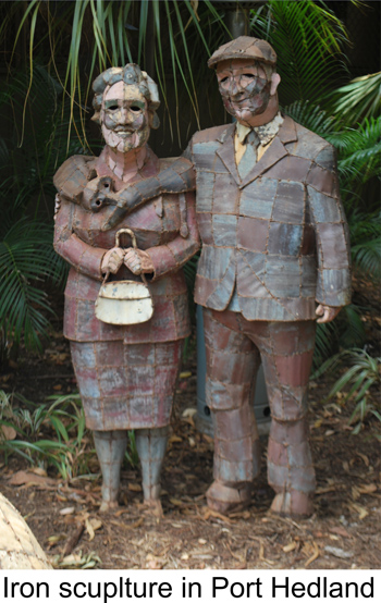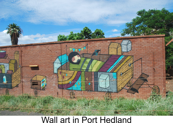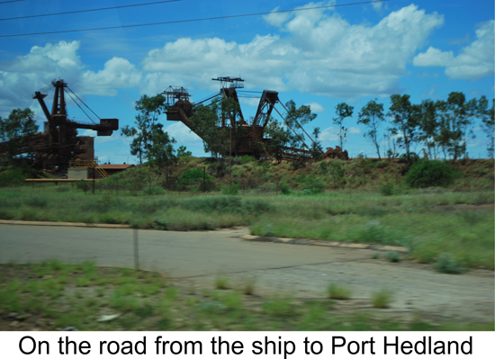 Port Hedland is the major port for shipping Australian iron ore and one of the few ports capable of handling the huge bulk carriers in which the ore is shipped out. The region around Port Hedland is called Pilbara which means dry in one of the aboriginal languages. To which I would add hot since the temperature is hovering around 100 degrees But we did find that surprisingly, Port Hedland has a lot of art, iron sculptures in the streets, wall art all part of the 'Pilbara Project'. The project is funded by the state and private sources and is a effort to record and preserve the original life of the area, both native and European. One facet of that project involves native artists -- women when we were there -- creating traditional art work. We were able to talk to them about how they worked and what their work meant. For someone interested in art it was fascinating. Their workshop was air conditioned so we were able to spend some time talking to them, but eventually the heat got to us and we had to leave. For most of our fellow passenger, however, Port Hedland had nothing to offer, a few shops, no real restaurants, no scenic areas or beaches -- unless you like industrial machinery. In fact the only reason I can think of for stopping at Port Hedland is that it's the only place on the Australian west coast aside from Fremantle that can handle a ship the size of the Solstice. |