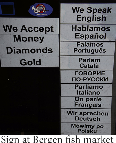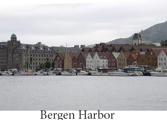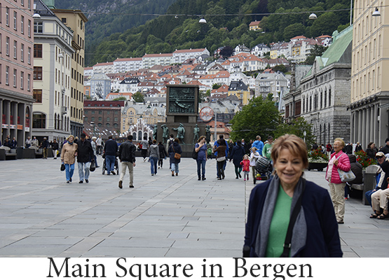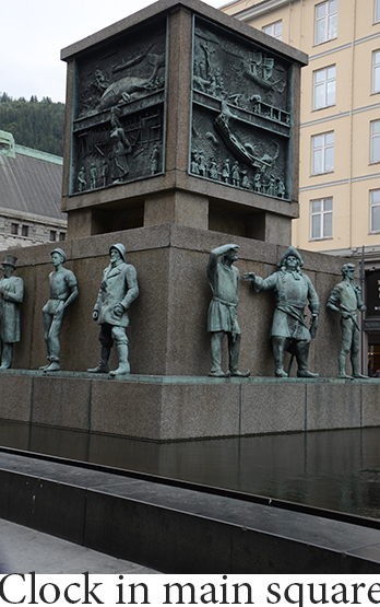 Bergen is one of Norway’s largest cities with a population of about 274,000. It is a major trading and shipping port and is considered the gateway to the fjords. We took a shuttle bus from the ship to the city center where the Bergen art museum. We walked from there through the Tormalmenningen a along shopping and restaurant area closed to traffic. Later in the day a concert by the band of the King’s Guard but we had to get back to the ship before it took place. We wakged through the area to the fish market and the hanse buildings. We also visited the open-air market. Bergen has numerous parks and there are sculptures scattered throughout the area. |