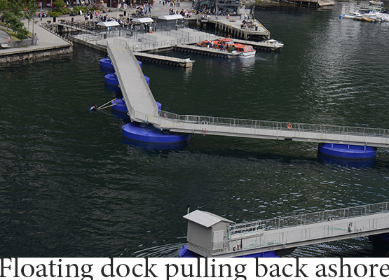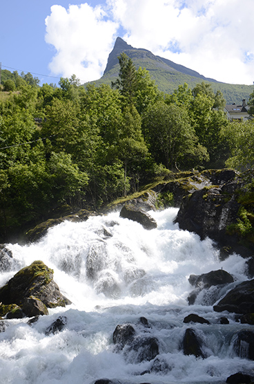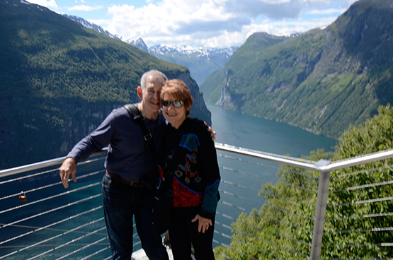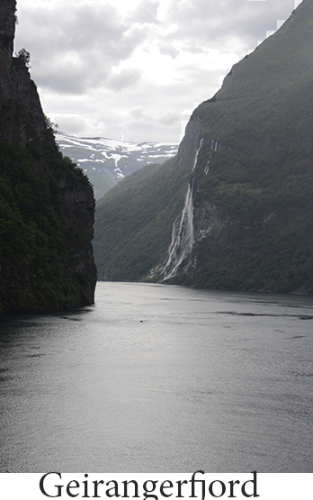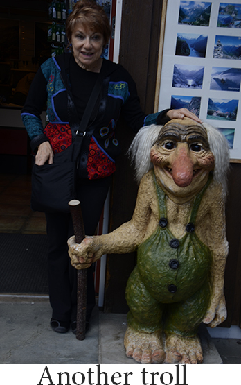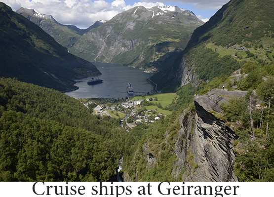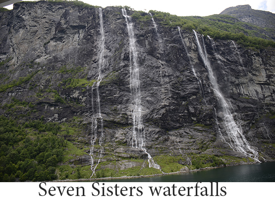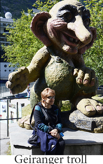 Cruising through Norway’s fjords, every scene looks like it belongs on a picture postcard. But Geiranger at the head of Geirangerfjord is probably the most beautiful and scenic spots of all. We walked from the ship to the small village (250 people) and bought tickets for the bus that would take us up to the two scenic overlooks in the area. Since we had a couple of hours before the bus trip., we began our tour by walking up to a waterfall just outside of town. It was a fairly steep climb but worth the view. We made it back well in time for the bus which went first to the Flydalsjuvet viewpoint and then back through Geiranger to the Eagle Road viewpoint. The roads are incredibly steep and many switchbacks as we climb to the top of the mountain viewpoints. The views of the snow-capped mountains and waterfalls are beyond belief. There is the Seven Sisters waterfall which spills from the top of the cliffs 5,000 feet into the fjord. Laura asked our bus driver if there were many accidents on the road. He told her there were a few every year. He showed us where the most recent one had occurred. It turned out the the people involved were incredibly lucky as their camper was caught by a tree instead of falling 1000 feet into the fjord. Geiranger has a floating dock which when not in use the dock is folded back against the shore. When a ship comes in the dock is extended out to provide a walk way from the ship to the shore. |