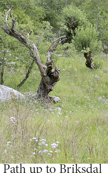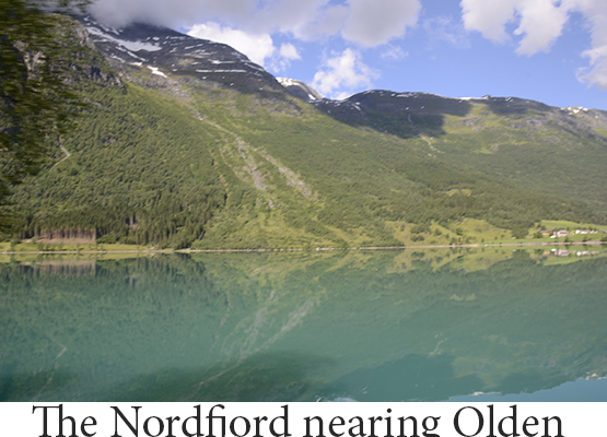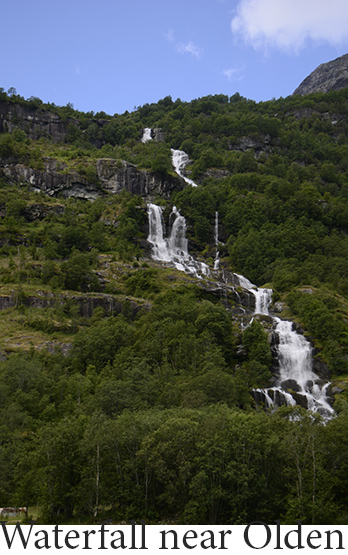 Olden is a small farming village of about 300 people at the head of the Nordfjord, the longest fjord in Norway. The fjord was voted the most beautiful in Norway, but the town itself consists of a gas station, a couple of churches and a souvenir store it is a jumping off point for trips to the Briksdal glacier an arm of the Jostedal, the largest glacier in Europe. We boarded a bus at the ship for a 45-minute ride to the foot of Briksdal Mountain. Getting to the glacier involves a 2-mile steep uphill hike over dirt paths. Along the way we passed numerous waterfalls, fields of wild flowers and three stray goats. At the foot of the glacier is a small lake filled with ice that breaks off from the glacier. The lake is green a color caused by powder from the rocks picked up by the glacier as it moves over them. We were close enough to clearly see the ice ridges caused by the pressure of the ice as it forces its way down the mountain. The glacier ice is supposed to be blue but it looked gray to me. Our guide told us the the Briksdal glacier advances and retreats in 11-year cycles. There are markers shows the farthest advance of the glacier 220 years ago, 100 years ago and 25 years ago. What will happen in this age of global warming is anyone’s guess. One of the legends of the area is that is you pile up three stones one atop another you will return to Briksdal. Laura decided to see a different arm of the Jostedal, the Kjenndalen glacier. To do this she took a cruise on Lake Loen which stopped at the foot of the glacier. A 10-minute walk brought her up to the glacier. The cruise also featured fantastic views of the little villages along the lake and the mountains surrounding the glacier. |