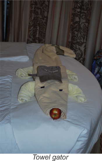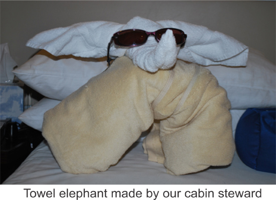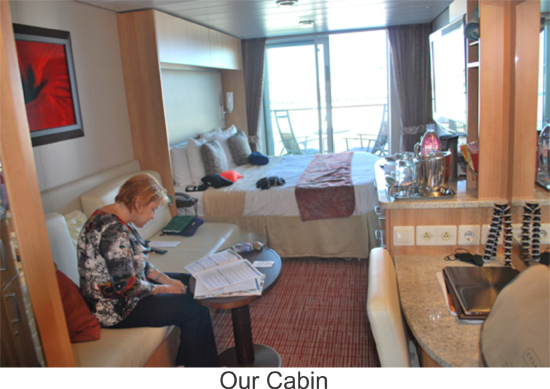 Celebrity Solstice is one beautiful ship, 1000 feet long all clean and up to date. She carries up to 3000 passengers but there is lots of room for everyone in the dining rooms, lounges, the theater and even in the casino. She is by far the nicest ship we've ever been on. We have a mini-stateroom up on deck 8 with a comfortable couch, a king-size bed and even better, a full-sized bathroom with a real shower and lots of cabinet space. We have a balcony where we can sit and read or eat breakfast. The balcony will face land all the way around Australia so we can see the scenery from our stateroom whenever we want. The ship has three specialty restaurants, Asian, French and northern Italian as well as two main dining rooms and two buffet-style eating areas. The food is really good but Celebrity is known for that. There is a very well-equipped gym which we visit most every morning. The service is very good but it has been good on every cruise we've been on. The cabin steward sometimes makes us a towel animal which appears when we get back from dinner In our past cruises to Canada and the Caribbean, the majority of passengers aboard were Americans. But here, Americans are in the minority, mostly Brits and Aussies and Asians. It's been nice meeting people from all over the world. Boarding the ship in Auckland was really smooth. The lines moved right along and got on the ship very quickly. It took about two hours for our rooms to be ready during which we had lunch in the deck 14 buffet. Our baggage even arived almost immediately -- a first. The nice thing about a suite is that there is a lot of room to store everything and still leave room to move around . We can easily get used to this. |
