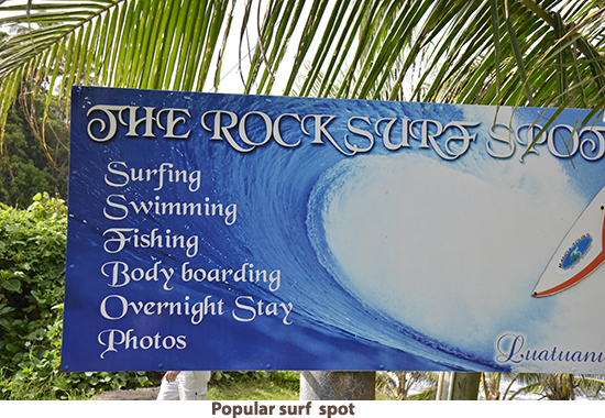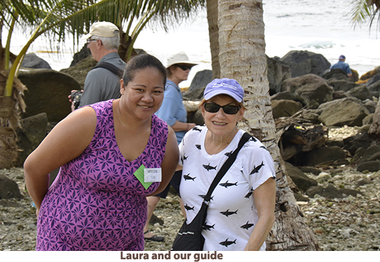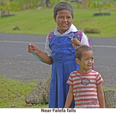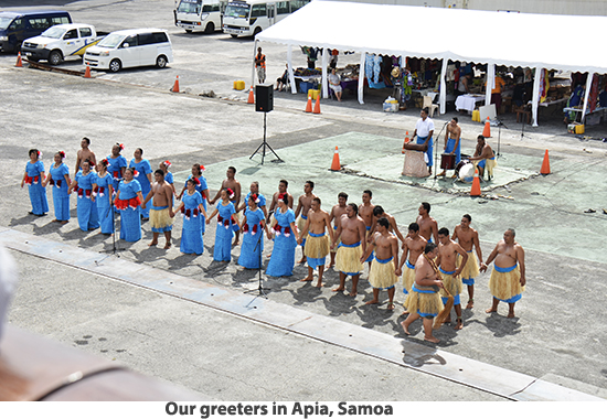 The Pacific is a very large ocean, larger than all the rest combined so it took us almost four days of 18-knot sailing to reach our next port of call, Apia, Samoa on May 23. The nation of Samoa, which consists of seven islands, was under German control until after World War I. The capital, Apia, on the island of Upola, was laid out and built by them. But once you drive out into the countryside the whole character of the island seems to change. There are still many of the open buildings (without walls)that were used by the Polynesians as tribal dwellings. There are also newer buildings with walls. Polynesians are a communal people and generally live together in tribal groups and carry out most activities in the communal buildings. We decided to take a tour of the Upola countryside driving through a number of coastal villages with a final stop at a tropical garden. Our guide told us a lot about Samoa not much of it very good. Three-quarters of Samoa’s population lives in Apia and half of them don’t have jobs . She said that the government was really trying to lure some industry to the islands but so far to no avail. The houses in the countryside, with a few exceptions, are in need of paint and repairs. There were lots of dogs running around that are sort-of pets — they run wild except when they come home to be fed. The countryside itself is lush, very green with beautiful flowers and the graceful palm trees you expect in the south seas. One of our most picturesque stops was at a surfing spot along the coastal road. There was a ramp with a very inventive selection of beer bottles set in the concrete. There also was a house where they sold snacks, lots of color. We stopped at Falefa falls with lots of flowers but what was most interesting were the Samoans walking along the road. Our last stop was Gina’s Tropical Gardens where they grow coconuts, breadfruit, mangoes, papaya and beautiful flowers. There we got to sample the fruit and saw demonstrations of breadfruit preparation, using coconut to give it flavor. One of the men at the gardens cut some coconut fronds and wove the leaves into a plate, a basket and a hat, all in less than five minutes. We then drove back through Apia and back to the ship. |