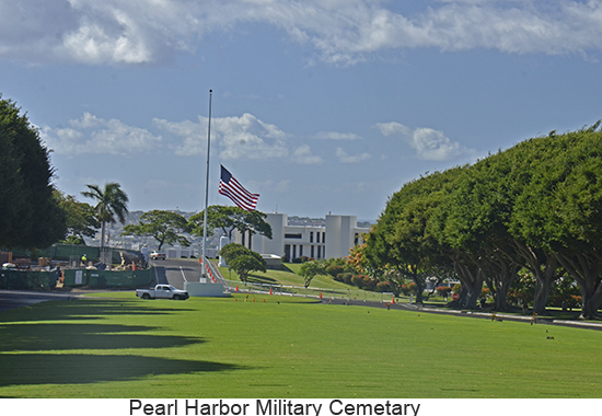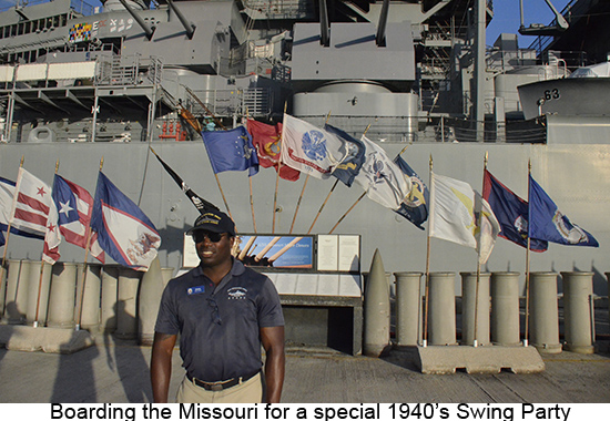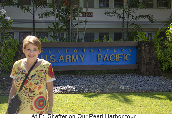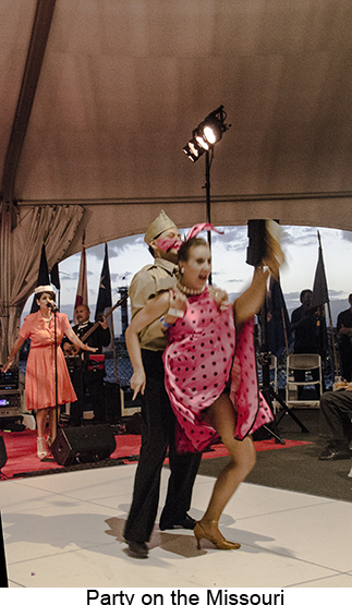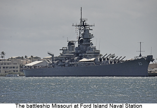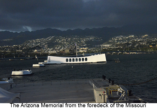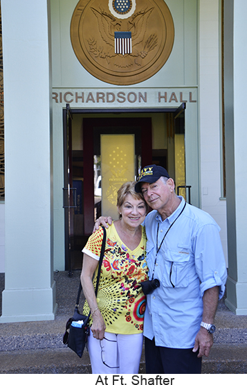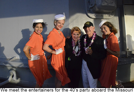 Our next stop was Honolulu and a full day tour of the sites of the attack on Pearl Harbor including Hickham Field, Wheeler Field, Schofield barracks and the Pearl Harbor site itself. It was a very well done tour with highly knowledgeable guides — especially for vets. We actually had one WWII vet on our tour. One of the guides(ex-navy) asked me to write up one of my experiences running my riverboat in Vietnam for a book he was doing on command decisions. In the evening there was a special party for the round-the-world cruisers — about a third of our passengers. The party was on the battleship Missouri tied up near the Arizona memorial. To get to the ship we hqd to go through the Ford Island naval station so the party was off limits to non-U.S. citizens. The theme was 1940s swing with very creditable imitations of the Andrews Sisters and a swing band. The food and drinks were fabulous and fortunately, I wasn’t driving. I’m not sure why Laura and I were invited since we were not part of the round the world contingent, but I’m very glad we were. |