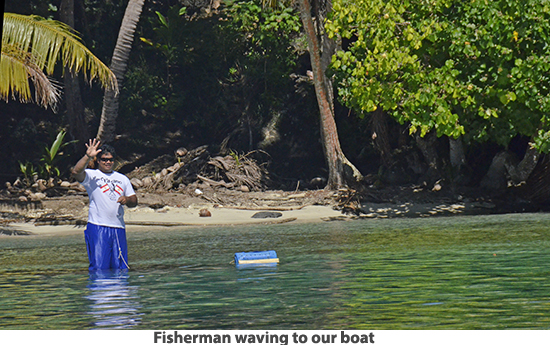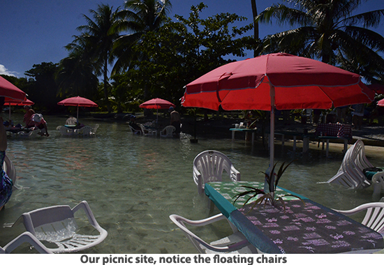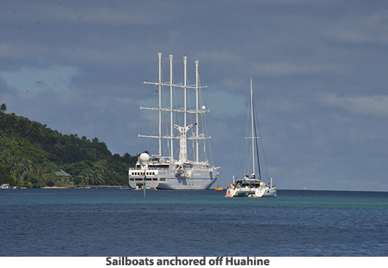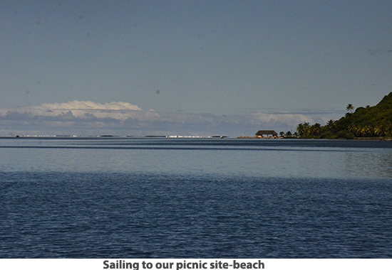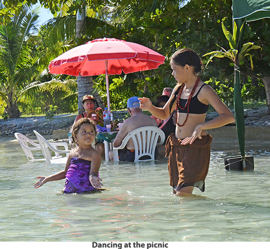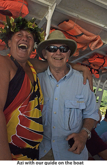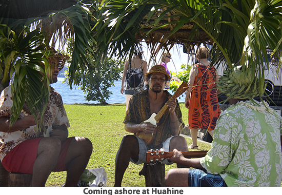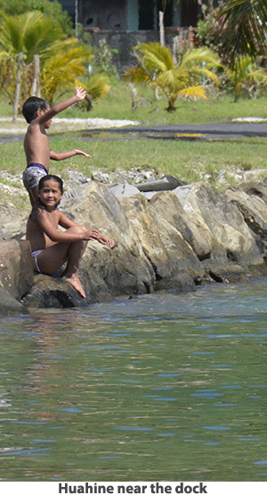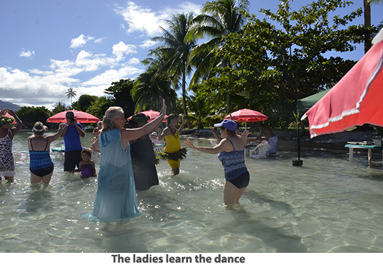 Huahine is known as the “Garden Island” though it doesn’t seem any more lush and green than its neighbors. It is beautiful, with white beaches and clear green waters. We got to the pier an hour early so we took a shuttle bus around the island. Seemed like a good idea at the time. Was the buses. It seems like they took a cube van, removed the cube and replaced it with a wooden cabin that extended eight feet beyond the rear wheels and had 62-inch headroom. It felt like they had replaced any shock absorbers with old-fashioned leaf springs. To say the ride was rough was a real understatement. On the other hand, we did get to see the island. Our tour was a boat ride through the lagoon to a beach where we had a Polynesian lunch. The boat ride was relaxing and the lunch was good but it was not on the beach, it was in the water just off the beach. It was actually sort of cool except that the plastic chairs kept floating away when you got up. There was lots of Hinano beer though. After lunch the ladies were taught a Polynesian dance and then, after more beer, we took a short walk to the ocean side of the point where we had a swim. The water was so clear that you did not heed a face mask and snorkel to see the fish, all you had to do was look down. After an hour of swimming and sunning we walked back across the island and boarded the boat for a ride back to the pier where we picked up the tender back to our ship. |