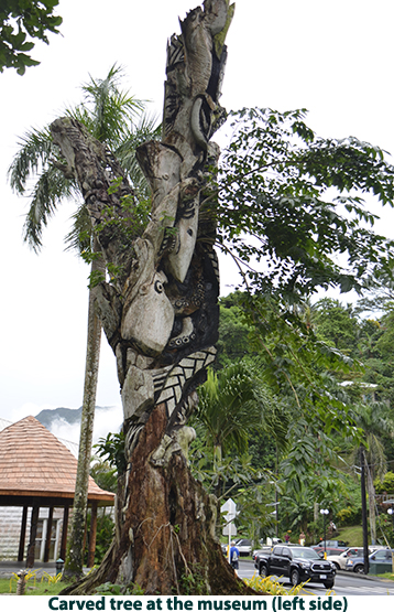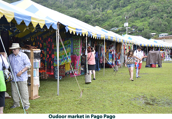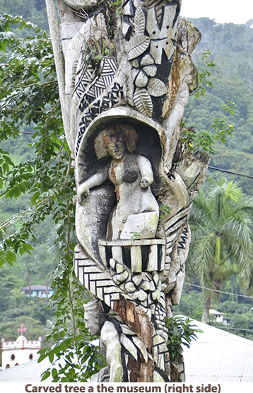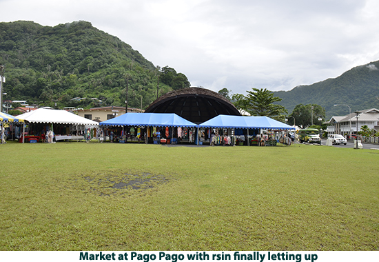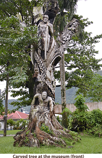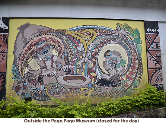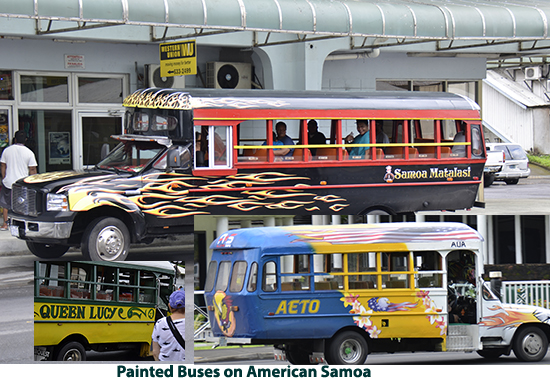 After leaving Apia we crossed the International Dateline so we got to do May 23 all over again when we docked at Pago Pago in American Samoa. It rained during our visit so we got a bit damp as we walked up to the National Marine Sanctuary museum. The National Marine Sanctuary of American Samoa is made up of six sites across the territory. The area in Fagatele Bay near Pago Pago supports the greatest diversity of marine life in the entire National Marine Sactuary System. It supports 168 species of coral including a massive coral head 20 feet high and nearly 200 feet around, 271 species of fish, sea turtles, dolphins and humpback whales. It talked to one of the staff at the sanctuary who told me the dives runs from 30 to 100 feet and the water is so clear you don’t need lights. There are many top dive sites in the south seas but this is one I want to come back to dive at my leisure. When we came out of the sanctuary building, the rain had let up and we walked into the town. We were passed along the way but numerous buses painted in bright colors with a variety of designs. We found that the Pago Pago museum was closed but we got photos of the fantastic wood carvings outside. We then strolled off to one of the ever-present markets. Lots of good photo opportunities but not much we wanted to buy. After strolling around the town, we walked back to the ship and set sail for French Polynesia. I have to say that everything in American Samoa seemed to be in a lot better repair than in Samoa. Of course there are far fewer people in American Samoa and there is a lot of American support. |