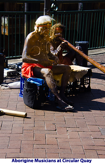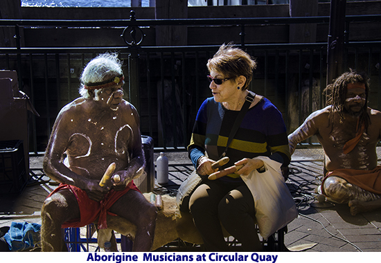 Oh Lord we’re back in Sydney again. When we left Australia three years ago Laura said we’ll never come back again but here we are after a 14-hour flight . Of course I just had to get back to the Fortunes of War pub, one of the few places I can get Tuohy Black ale. It was raining when we arrived, but no matter, we were so jet-lagged we hardly noticed. In any case we had to check in to the ship, unpack and figure out what was where on Oceania Insignia. We actually arrived a bit early so we were treated to a very nice breakfast at the Shangri-La hotel before going to Insignia our home for the next six weeks. Interestingly enough Insignia was moored at the Circular Quay, the same place that Solstice had been three years ago and the view of the opera house from our balcony was exactly the same. The next day was beautiful, sunny and warm, and we left the ship early and walked over to The Rocksa very old area of the city, populated by restaurants, pubs, and shops. We had a mission, presents for our grandchildren. So we spent the day strolling through the area until our mission was accomplished — and more. Laura found a hand-dyed outfit at a boutique which led to a interesting episode getting our VAT back. As we walked toward the opera house we passed aborigine performers — drumming sticks and a digeridoo. We stopped to get some ice cream and then headed back. It’s common to see people feeding the pigeons or even the seagulls. In Sydney they also feed the ibises — very strange. We made it back to the ship and managed to get our VAT refund. |