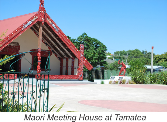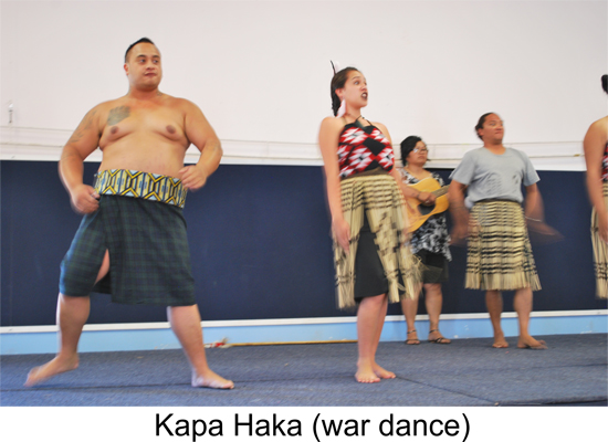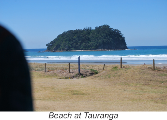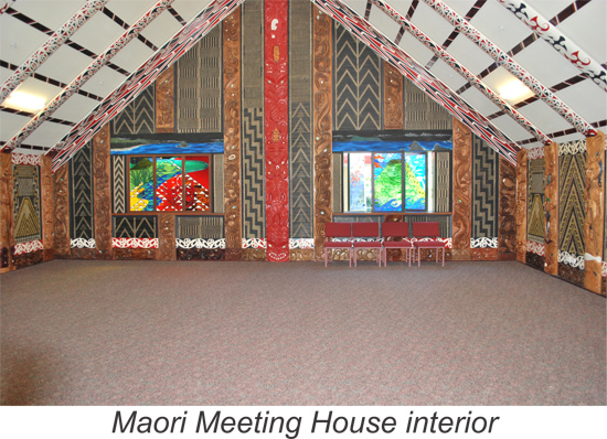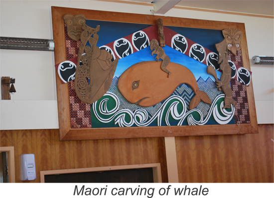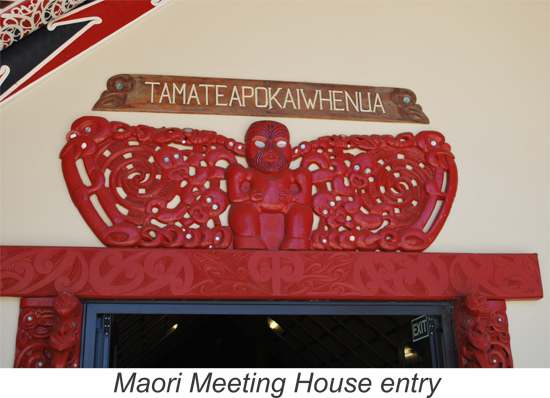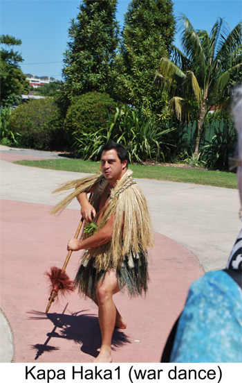 Tauranga, our first stop about 100 miles south of Auckland on the North Island of New Zealand. It is New Zealand's largest port and popular stop for cruise ships. Fotunately we were the only ship there otherwise the place would have been jammed. Like most of New Zealand the scenery is rugged with steep volcanic hills.Everything is very green and the flowers and trees are beautiful. One of the major exports of the area is lumber. There is a type of pine tree where the needles grow straight up from the branch. We've noticed that the produce in the area is better than most we can get at home. I guess the volcanic soil accounts for that. We took a tour to a Maori village, Tamatea, where the village elders explained aspects of their culture. The Maori are part of the new Zealand culture and economy like any other group, but at home they work hard to maintain their Maoriness. The long house is where everything happens -- weddings and funerals, meetings and private ceremonies. The walls are lined with carvings of ancestors done by men and symbolic weavings done by women. The Maori first arrived in the 14th century, sailing from Hawaii and other parts of Polynesia in outrigger canoes. The Maori are basically Polynesian stock but there has been so much intermarriage that they come in all colors shapes and sizes. We took part in a Maori greeting ceremony during which we were told of the history of the village, first established in the 15th century by Tamateapokaiwhenau, the captain of a canoe from Hawaii and his crew. After the ceremony we drove to a small elementary school, where a group performed Maori dances and songs including the Kapa Haka -- a war dance. There we a display of Maori crafts including some work by a bone and stone carver that was exceptional. Also on the walls of the school was ome work by an eight-year-old who Laura says has the talent to become a really great artist. |